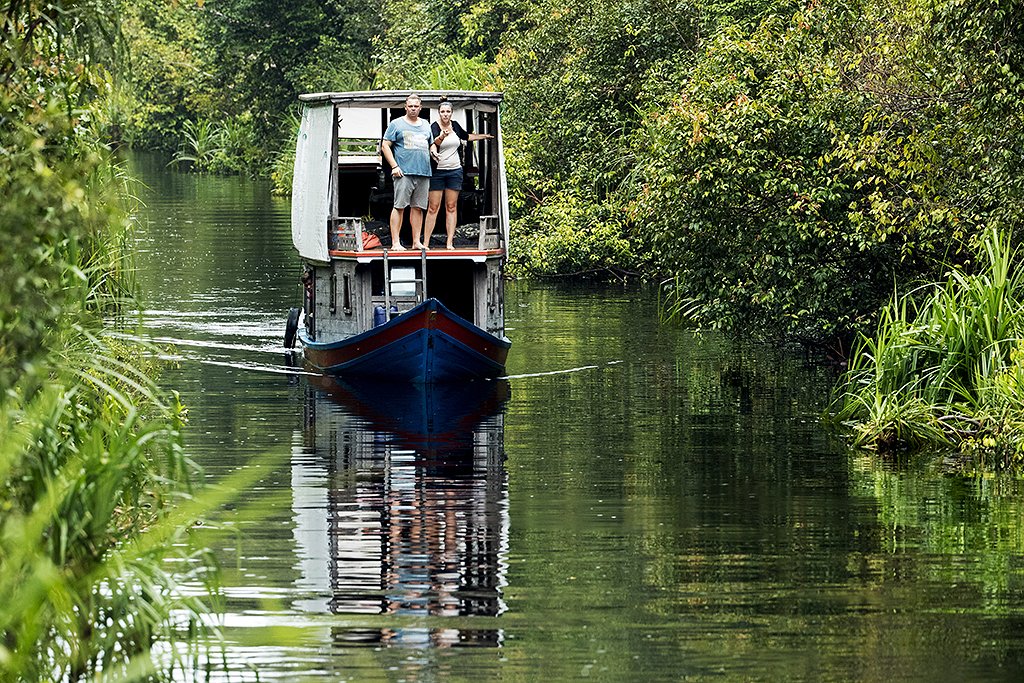 Båten har to etasjer, og på det øvre dekket har vi god utsikt til omgivelsene. Her er det bare å sette seg tilbake i godstolen, med kameraet klart. Etter en transportetappe på ei stor elv, kommer vi inn på ei lita elv. «Welcome to Tanjung Putin nationalpark» står det på et skilt. Eventyret begynner.