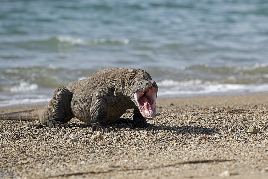 Vi må nøye følger alle anvisninger fra guiden, for komodovaranene skal man ikke komme i nærkontakt med. Spyttet inneholder en cocktail med opptil 50 ulike bakterier. Komodovaranen har ikke direkte tenner, men biter og river i offeret slik at giften og bakteriene trenger inn i åpne sår i huden og skaper infeksjoner. Deres strategi er å bite et byttedyr, en gris eller en hjort, og så la tiden jobbe for seg. Varanen følger så duftsporene etter byttet. Når byttet til slutt kreperer, gjerne innen 24 timer på grunn av blodforgiftning, er det klart for et herregårdsmåltid.
