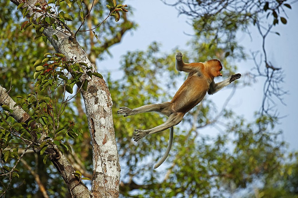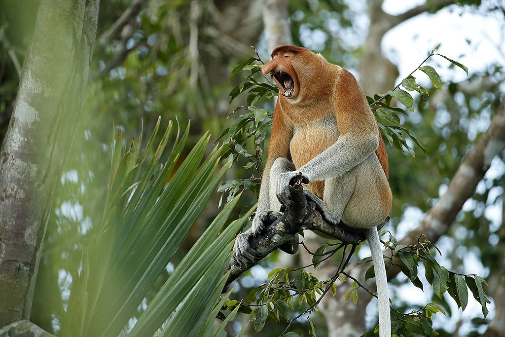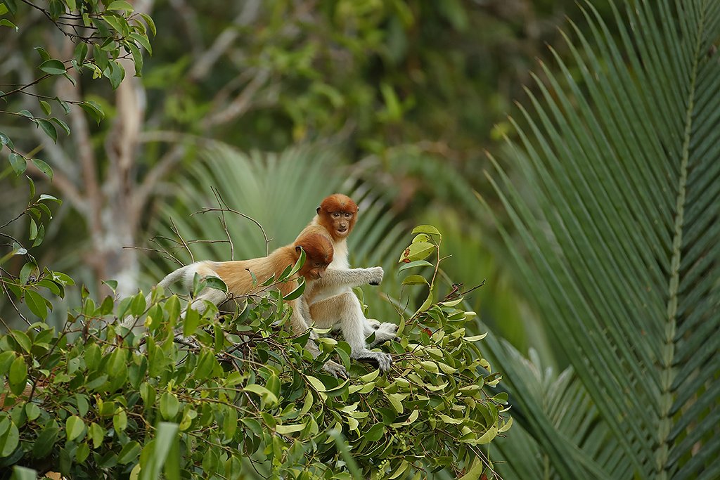 13. september: Vi står tidlig opp og spiser frokost. Så border vi båten og drar først til Pondok Tanggui for å fotografere orangutangene på en annen foringsplass. Deretter cruiser vi oppover floden i to timer til den berømte Camp Leakey. På veien oppover ser vi plenty med neseaper, og er vi heldig ser vi også den «falske gavialen», en krokodilletype. Etter hvert blir elva ganske smal, og ofte får vi neseapene på nært hold. Det er også mulig å se helt ville orangutanger som ikke er avhengig av foringsplasser.