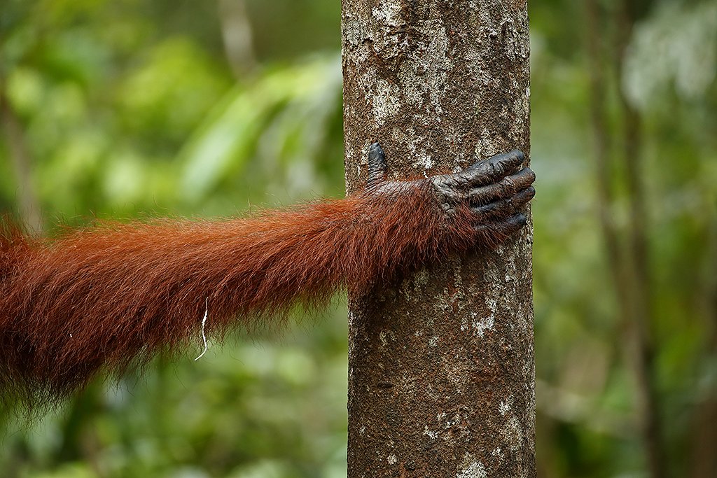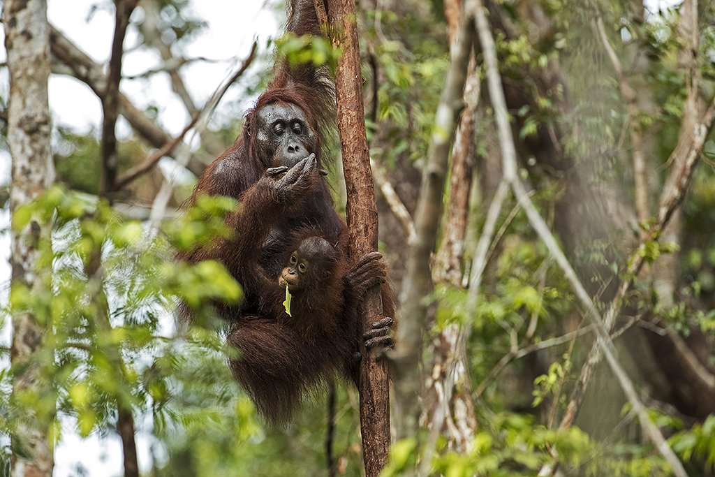 Snart kommer det til syne orangutanger oppe i trekronene. Det er utrolig å se disse store primatene bevege seg fra tre til tre så lett og uanfektet. En mor med en liten tenåring av en unge ser ned på oss. Mora sitter på ei grein, mens junior turner – henger opp, ned, spriker med beina og har den reneste gymnastikkoppvisningen for oss. Noen setter seg til på plattformen og koser seg med lunsjen. En annen kommer raskt innom og tar med seg så mange bananer gan kan – en i kjeften, en i den ene hånda, og en i det ene beinet og en i det andre beina. Så svinger den seg opp i trekronene med den ene ledige hånda. Og der oppe i fred og ro, blir det en god banan-lunsj.